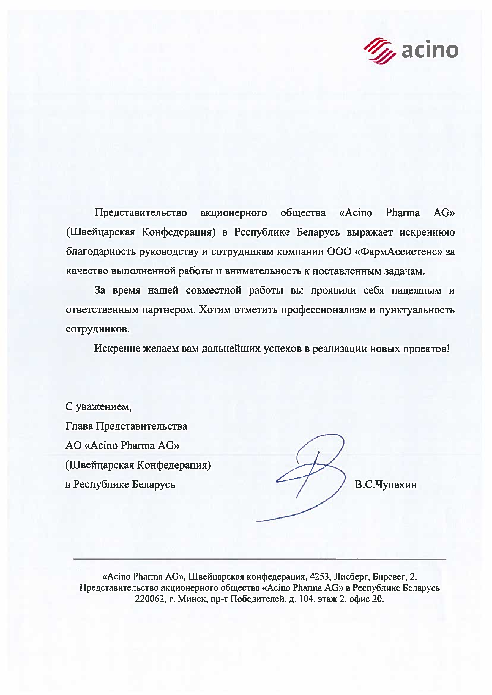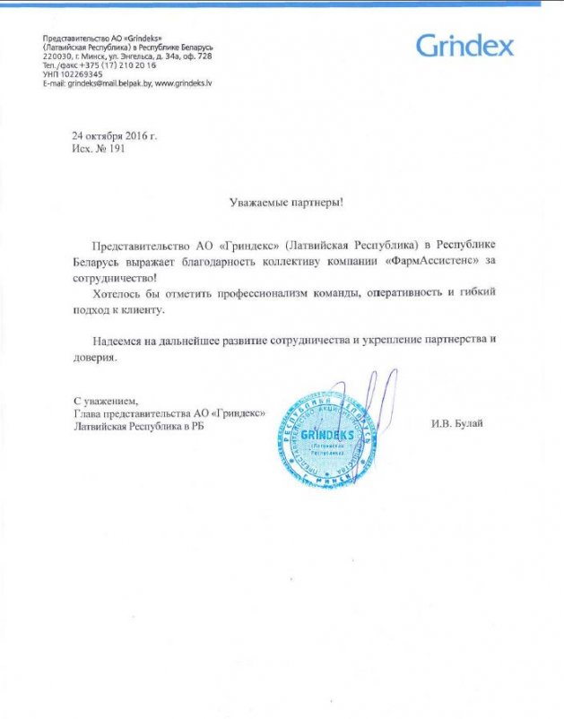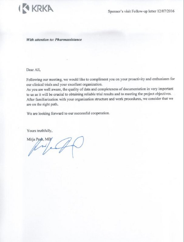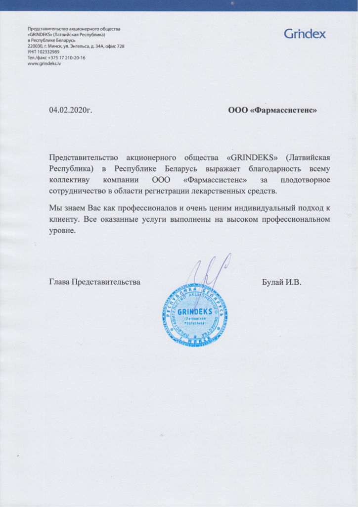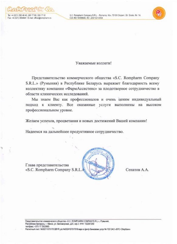 Company OA “AVVA RUS” expresses gratitude to the team “PharmAssistance” for the successful organization and conduct of a number of clinical trials. The work was done with high quality and on time.